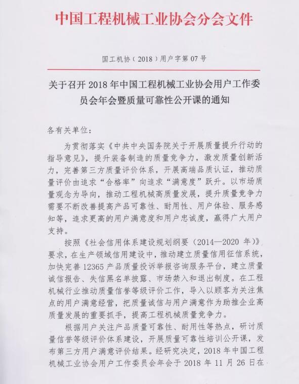 中國工程機械工業協會用戶工作委員會關于召開2018年年會暨質量可靠性公開課的通知