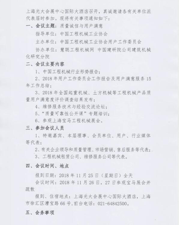 ? ?根據用戶關注產品質量可靠性、耐用性等熱點,研討質量信譽等級評價體系建設,開展質量可靠性培訓公開課,發布第三方用戶滿意評價結果。經研究決定,2018年中國工程機械工業協會用戶工作委員會年會于2018年11月26日在上海光大會展中心國際大酒店召開,真誠邀請各有關單位派代表屆時參加?,F將有關事項通知如下: